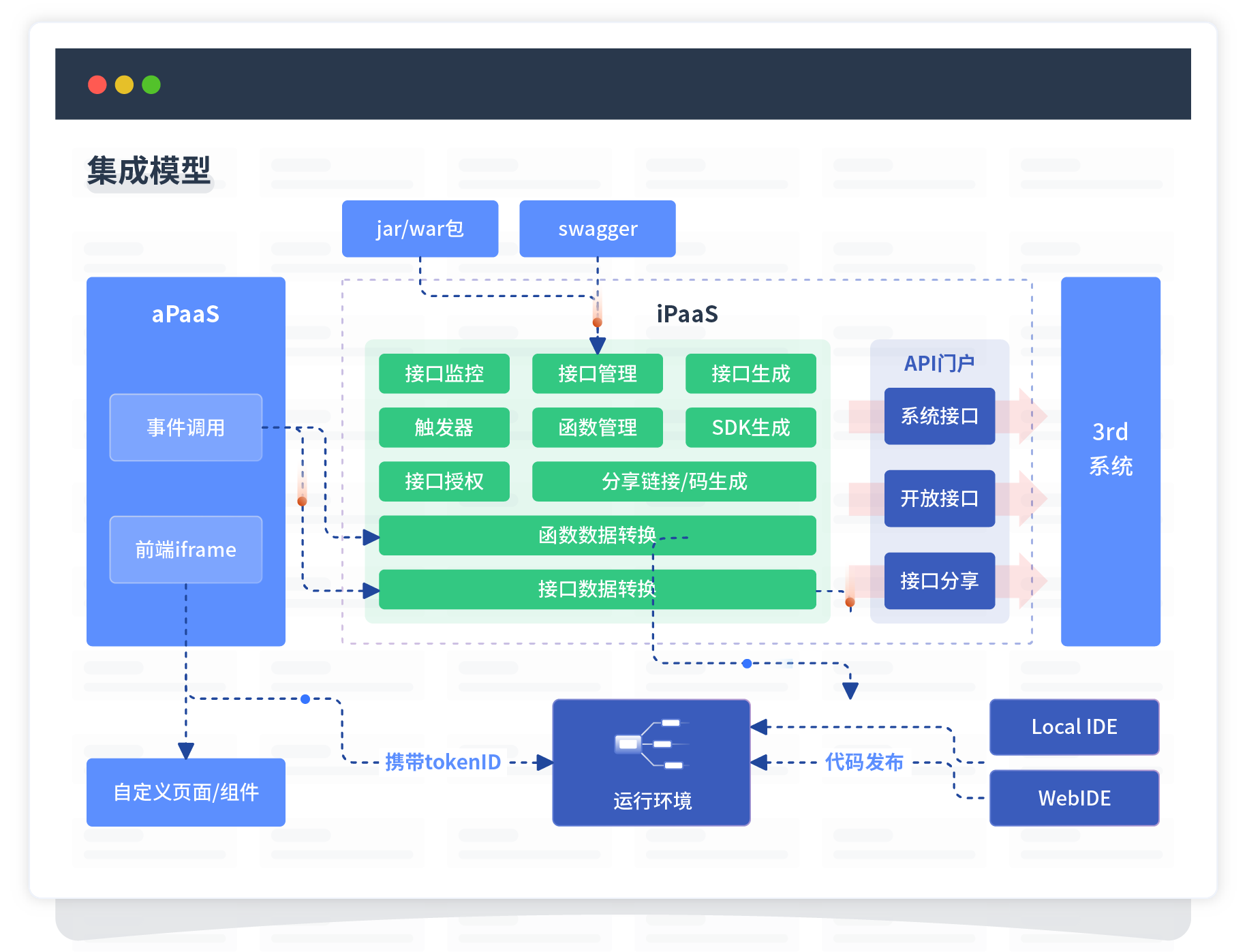 集成模型包括平台本身前、、、后端能力的扩展,,也支持通过API门户和第三方系统进行交互。。