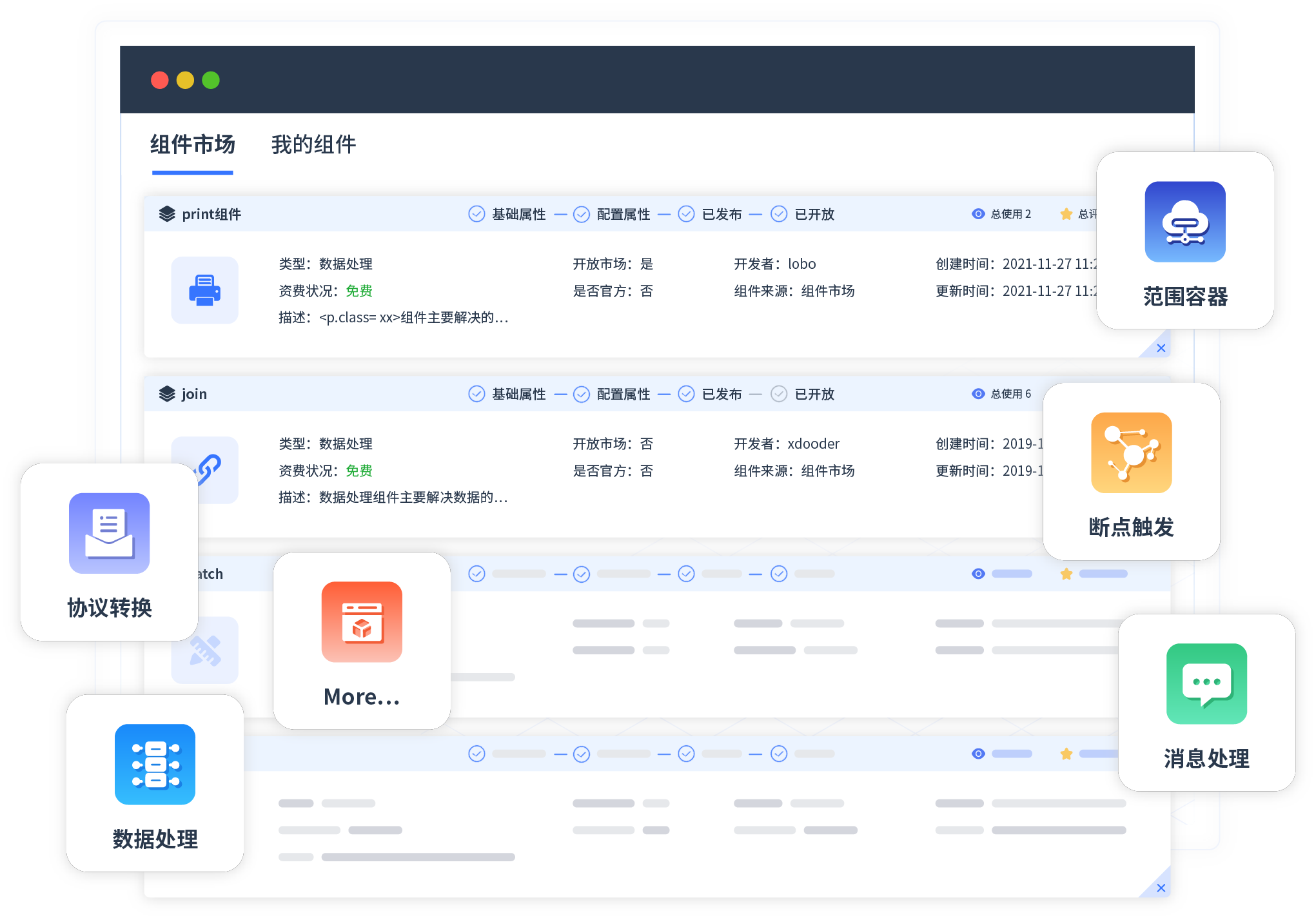 针对集成场景,,NO钱包提供组件市场,,例如协议转换、、消息处理、、、、文件操作等。。。除平台提供的组件外,,,,客户可以自定义所需组件。。。