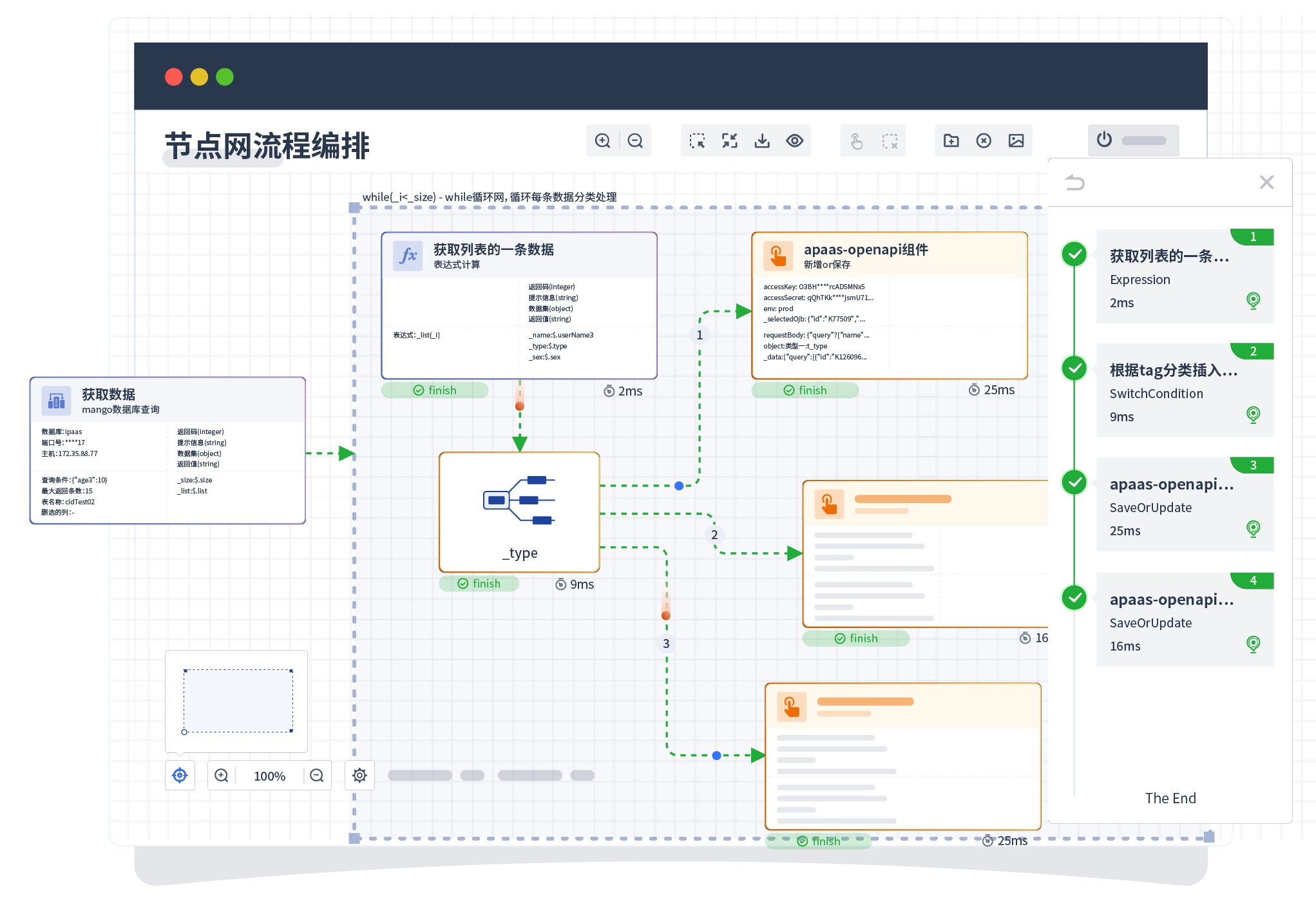 针对集成场景,,组件定义后支持进行流程编制,,,,不同于传统代码方式,,,,通过图形化展示,,,支持在线调试、、日志查看和运行回放。。。。