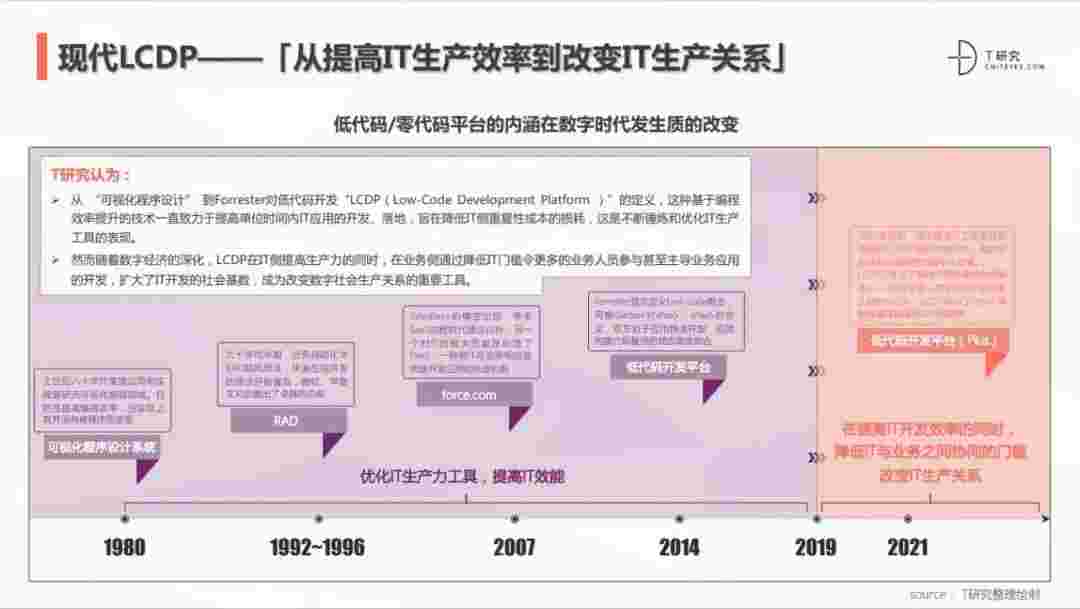 2020年前后,,,源于提高IT工作者开发效能的LCDP不断进化和衍生,,,,面对业务导向日益明显的数字化变革。。。LCDP衍生出了面向不同对象的升级服务——面向专业人群的LCDP和业务人群的NCDP,,LCDP与NCDP的不同服务属性被逐渐认可和接受。。。。 LCDP在提高IT开发效率的同时,,,降低IT与业务之间协同的门槛改变IT生产关系。。